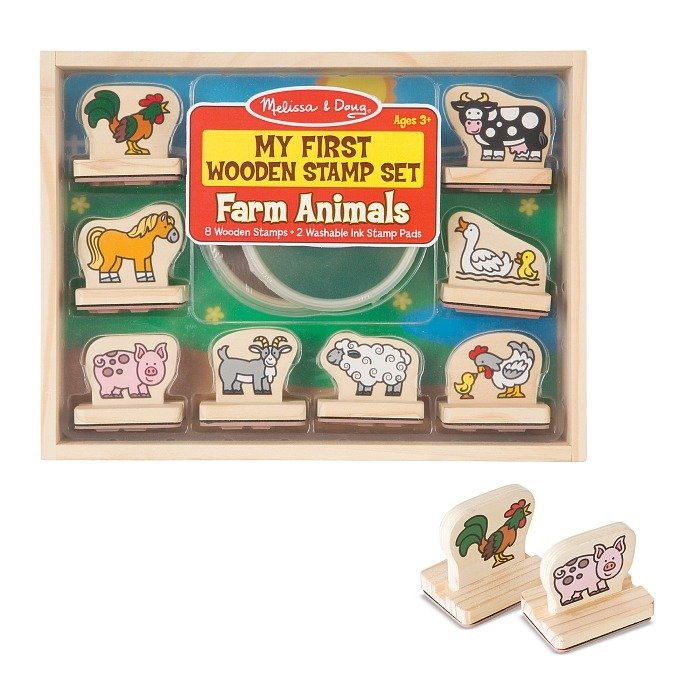 Набір «Мої перші штампи Тварини ферми» від Melissa & Doug розроблений для того, щоб подарувати малюкам радість творчості та знайомства з мешканцями ферми. Набір включає 8 великих дерев’яних штампів із зображеннями популярних тварин: корови, коня, свині, вівці, курки та інших. Кожен штамп оснащений високою ергономічною ручкою, спеціально адаптованою під дитячу долоню, що дозволяє дитині легко маніпулювати інструментом та отримувати чіткі відбитки.