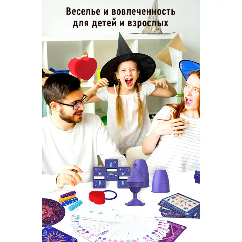 - 21 предмет реквізиту (карти, кубики, стаканчики, коробка з потайним дном, чарівна паличка та інше)