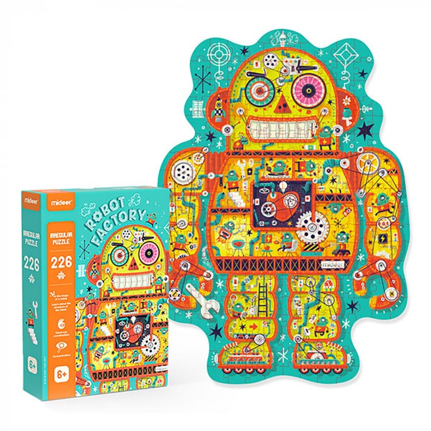 Пазл Mideer “Фабрика роботів” складається з 226 елементів, які перевертають уявлення про звичайне складання головоломок. Цей унікальний набір дозволяє не лише зібрати картину, а ціле панно у формі Робота, в середині якого оживають різні механізми: безліч кнопок, перемикачів, шестерінок і важелів, завдяки яким робот може функціонувати. Також сам робот розділений на декілька приміщень, усередині яких знаходяться інші “жителі”, що виконують свої завдання.