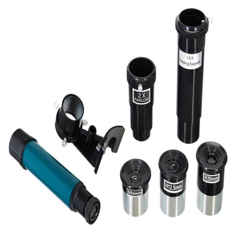 - Повна комплектація. У комплект входять усі необхідні аксесуари, щоб розпочати спостереження одразу після розпакування: два окуляри з різним збільшенням, шукач для швидкого наведення на об’єкти та стійкий штатив.
