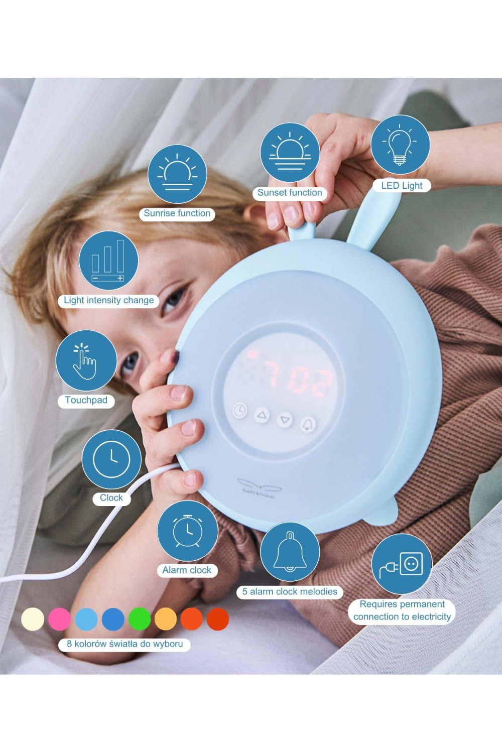 Ключові слова: лампа-пробудження, Rabbit & Friends, дитяча, світло, будильник, м’яке освітлення, зручність, затишок.