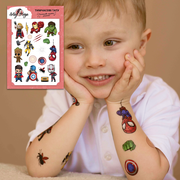 - Такі татуювання ідеально підходять для дитячих днів народжень, тематичних вечірок з супергероями, карнавалів або просто для веселого проведення часу вдома.