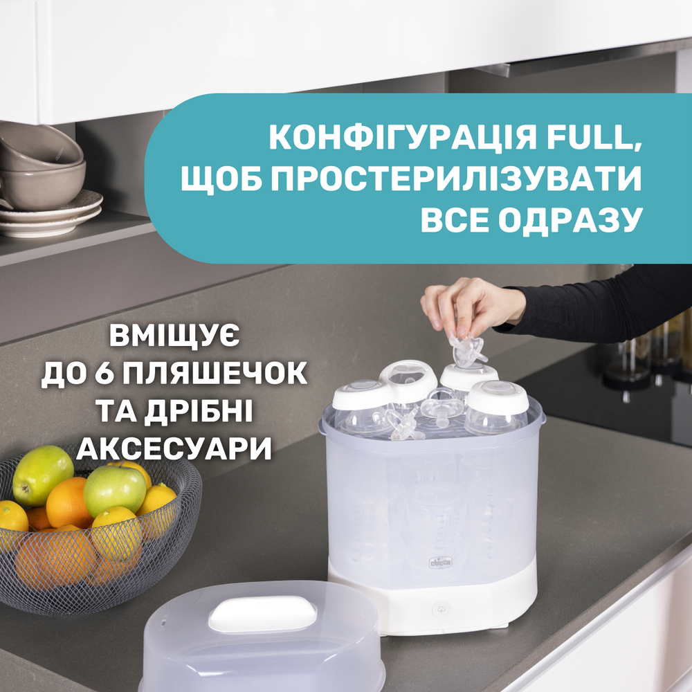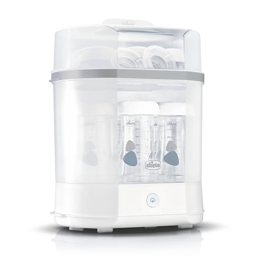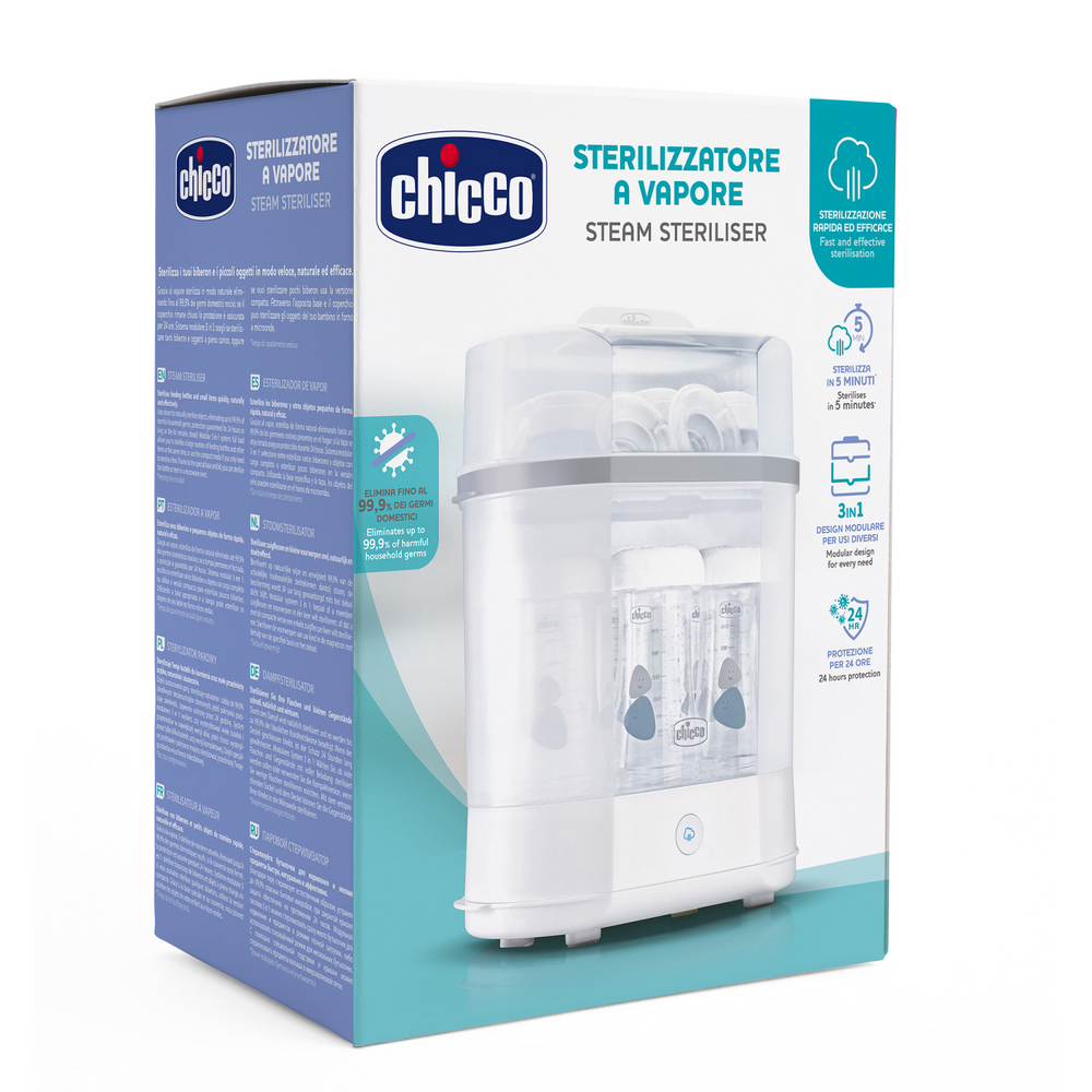 Chicco пропонує різні моделі електричних парових стерилізаторів, найпопулярнішими серед яких є модульні системи та моделі з функцією сушіння.