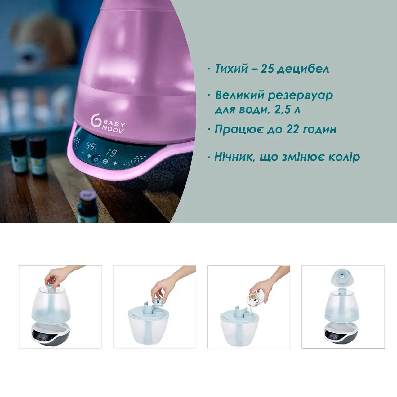 - Безшумна робота: Пристрій працює дуже тихо, що не потривожить чутливий сон дитини.