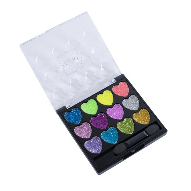- Формат: Продукт представлений у вигляді компактної палетки (футляра) з кількома комірками, наповненими тінями. Форма палетки може бути різною: прямокутна, кругла або навіть фігурна (зірка, серце).