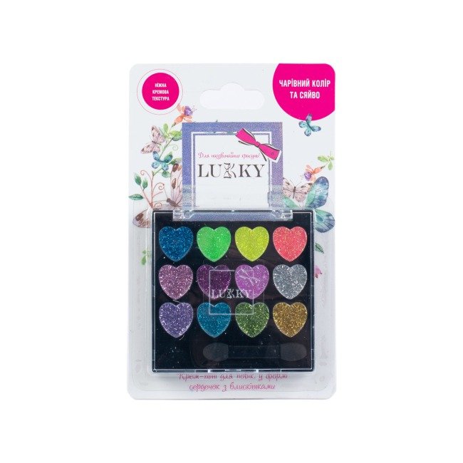 Дитячі крем-тіні для повік від ТМ Lukky — це ідеальний засіб для безпечного та яскравого ігрового макіяжу. Вони випускаються в палетках на різну кількість кольорів (найчастіше 6 або 12).