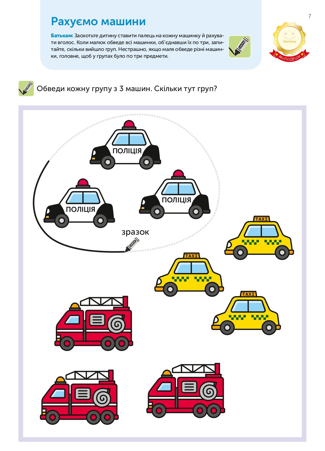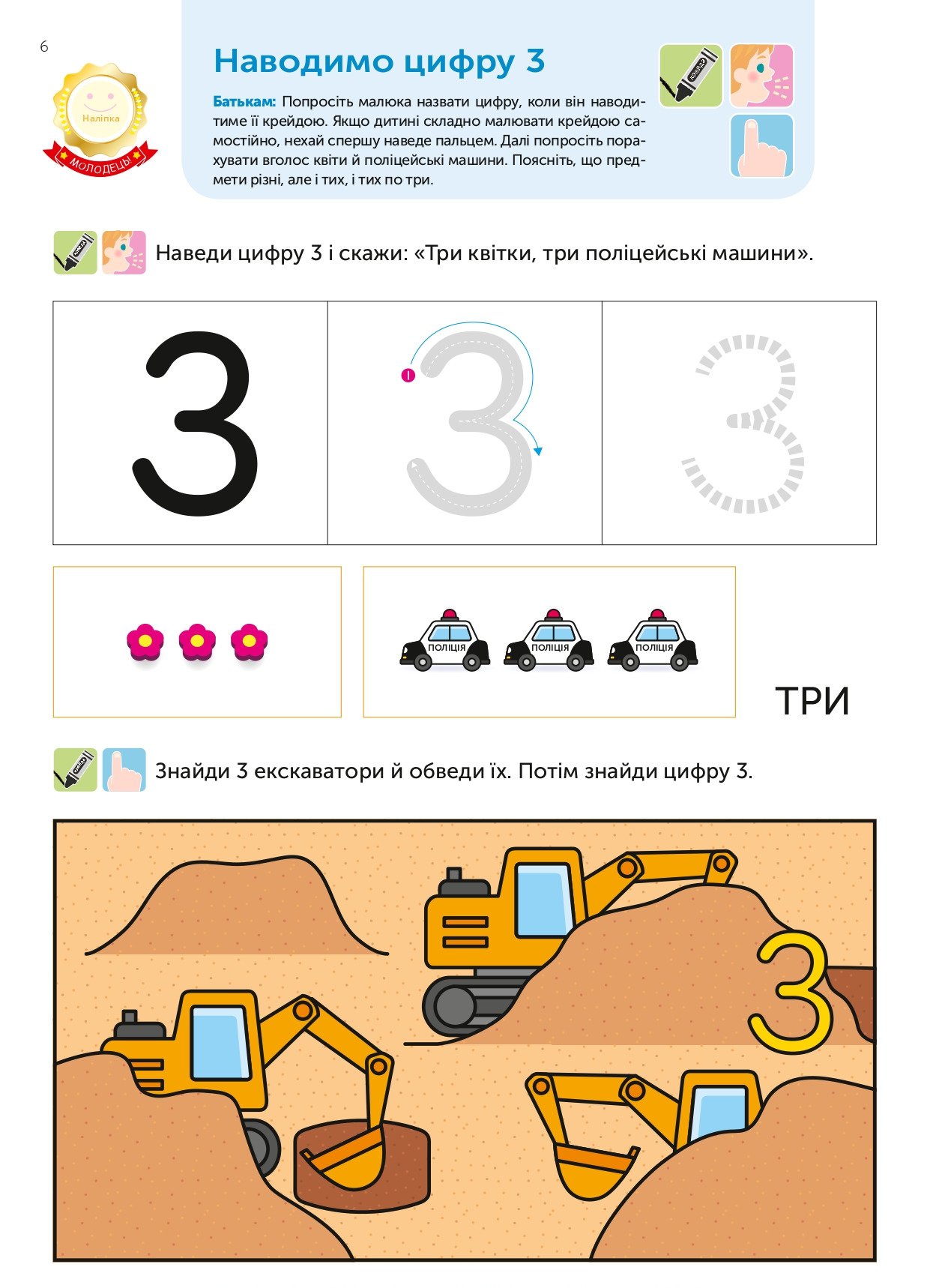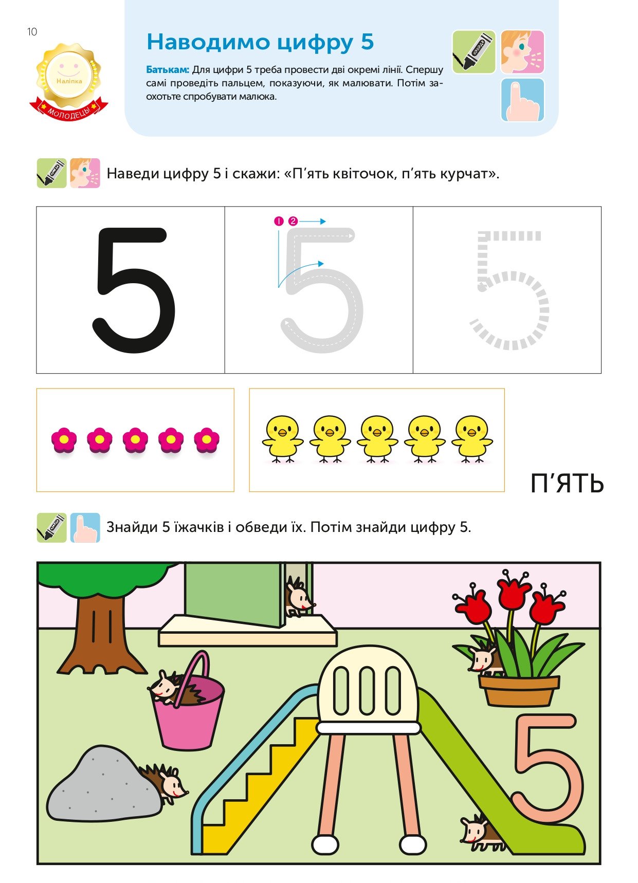 Хоча порядок чисел важливий, ще важливіше на цьому етапі плекати любов до навчання, тому сторінки цієї книжки не обов’язково проходити у якійсь визначеній послідовності. Якщо маля виявляє інтерес до певного числа або вправи, займайтеся ними, доки стане цікавості. Якщо ні — зробіть перерву чи перегорніть на іншу, цікавішу сторінку.