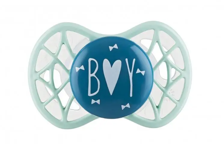 Пластина соски на 55% складається з повітря забезпечуючи майже повну аерацію області навколо рота, уникаючи скупчення слини, яка може подразнювати шкіру. Захисний ковпачок для соски для підтримки чистоти соски і стерилізації в мікрохвильовій печі простим додаванням води.