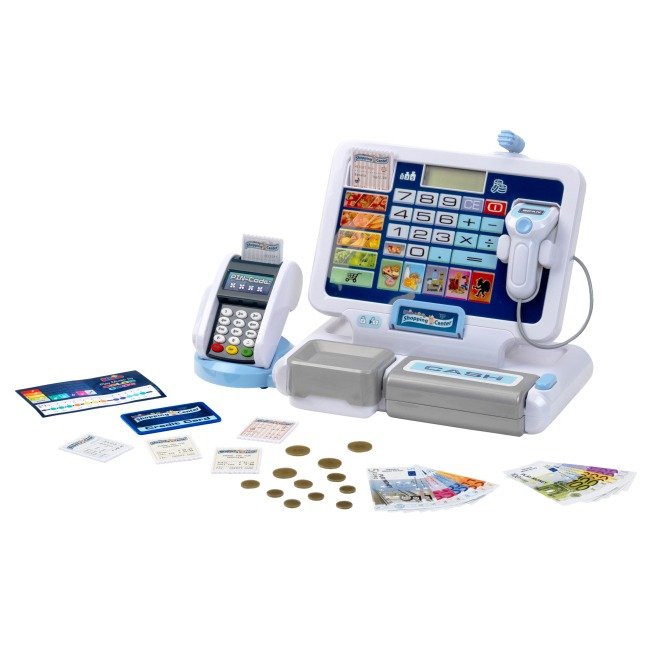 Платіжний термінал. Каса підтримує сучасні методи оплати — дитина може провести іграшковою кредитною карткою через термінал супроводжуючи це відповідним звуковим сигналом.