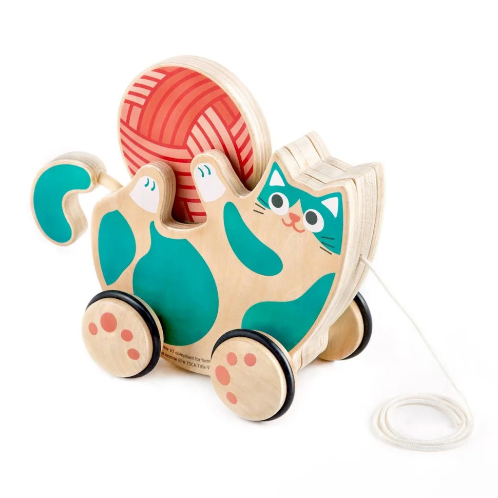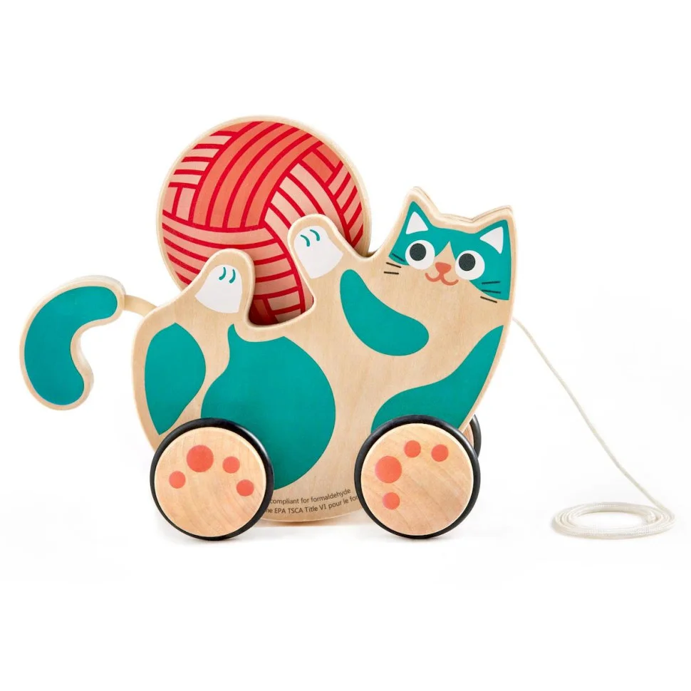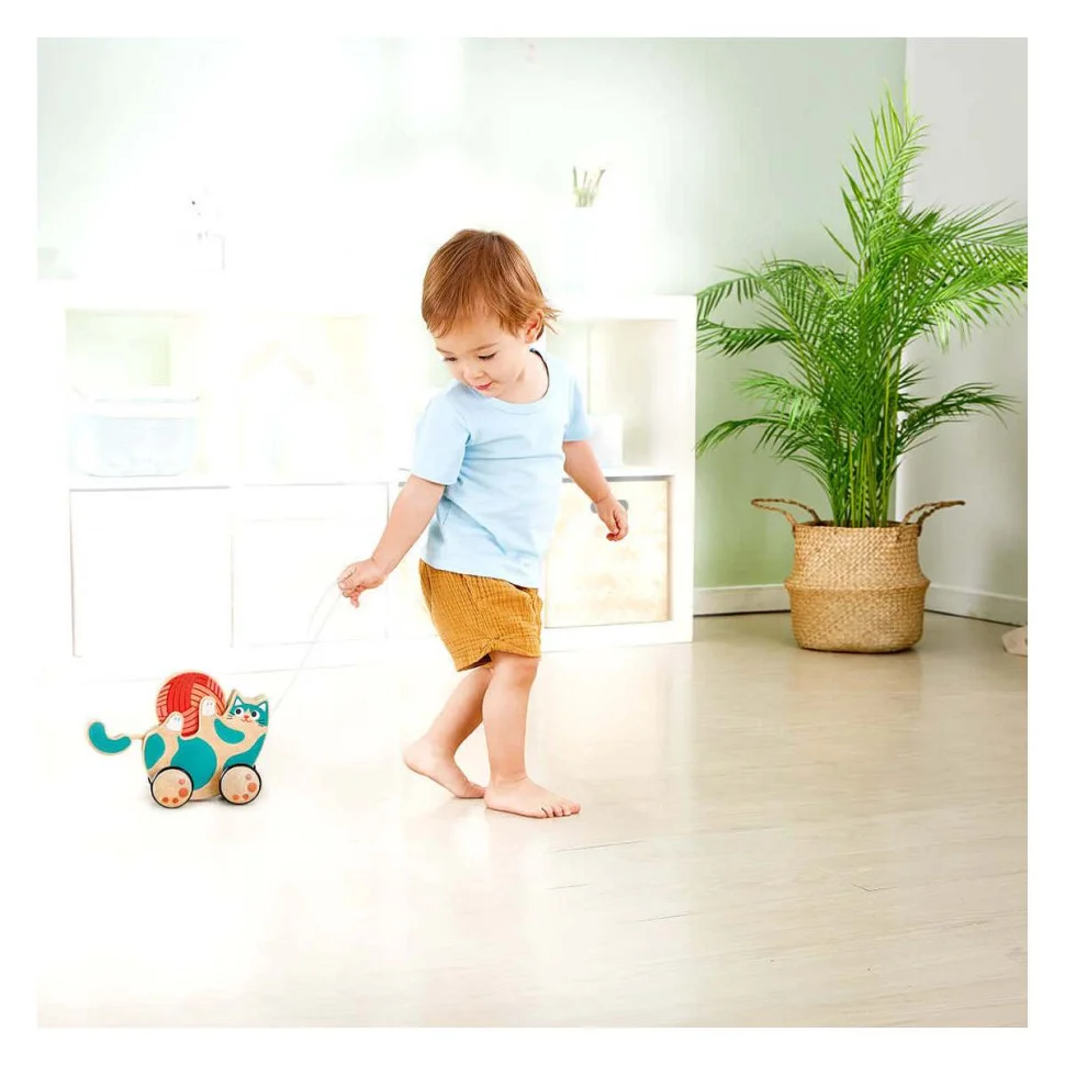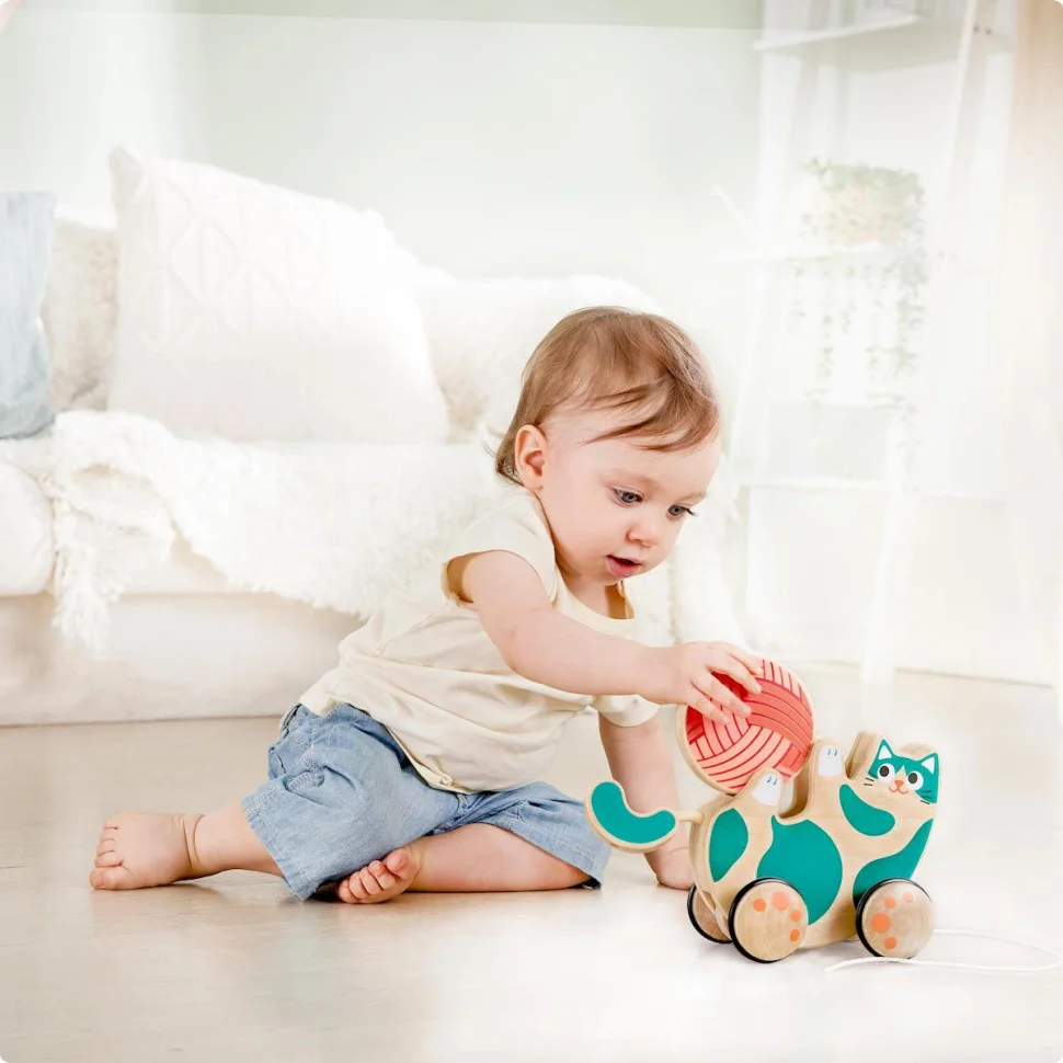- Дитина може тягнути каталку за мотузочку, спостерігаючи, як веселе кошеня рухається вперед та повзе за ним.