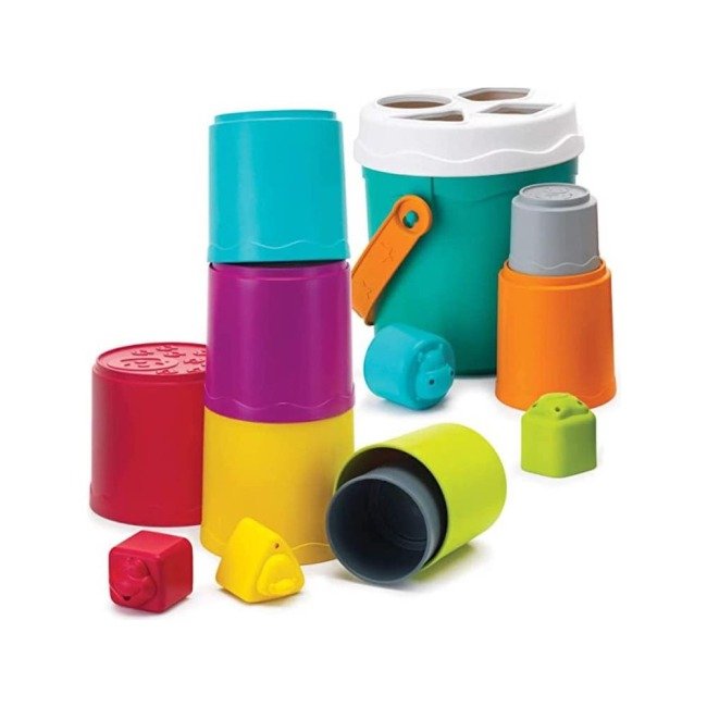 - Вежа кубиків із сортером: Набір складається з 8 стаканчиків різних кольорів та відерця з накладкою-сортером, через яку можна кидати різнокольорові кубики у вигляді геометричних фігур. Кожен стаканчик різного розміру, що дозволяє складати з них високу вежу до 70 см. На кожній чашці та блоці зображено окрему тваринку, що додатково стимулює пізнавальний інтерес.