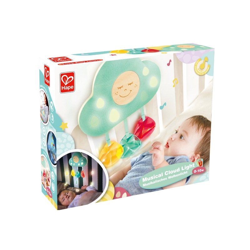 Музична іграшка-підвіска Hape Хмара створена для створення спокійної та заспокійливої атмосфери в дитячій кімнаті. Вона має заводний музичний механізм, який програває ніжні мелодії або природні звуки, такі як биття серця або падіння дощу. Хмара оснащена світлодіодним підсвічуванням з трьома режимами: яскравим, м’яким або повільно пульсуючим світлом.