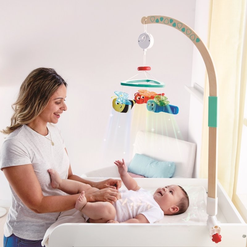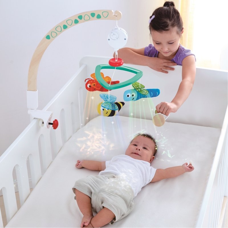 Мобіль Hape Солодкі сни – це чудовий спосіб створити затишну та релаксуючу атмосферу в дитячій кімнаті. Він оснащений регульованим дерев’яним кронштейном, який зручно кріпиться до сповивального столика або ліжечка. Мобіль складається з заводного музичного механізму, який грає приємні мелодії та прокручує текстильні підвіски у вигляді усміхнених комах.