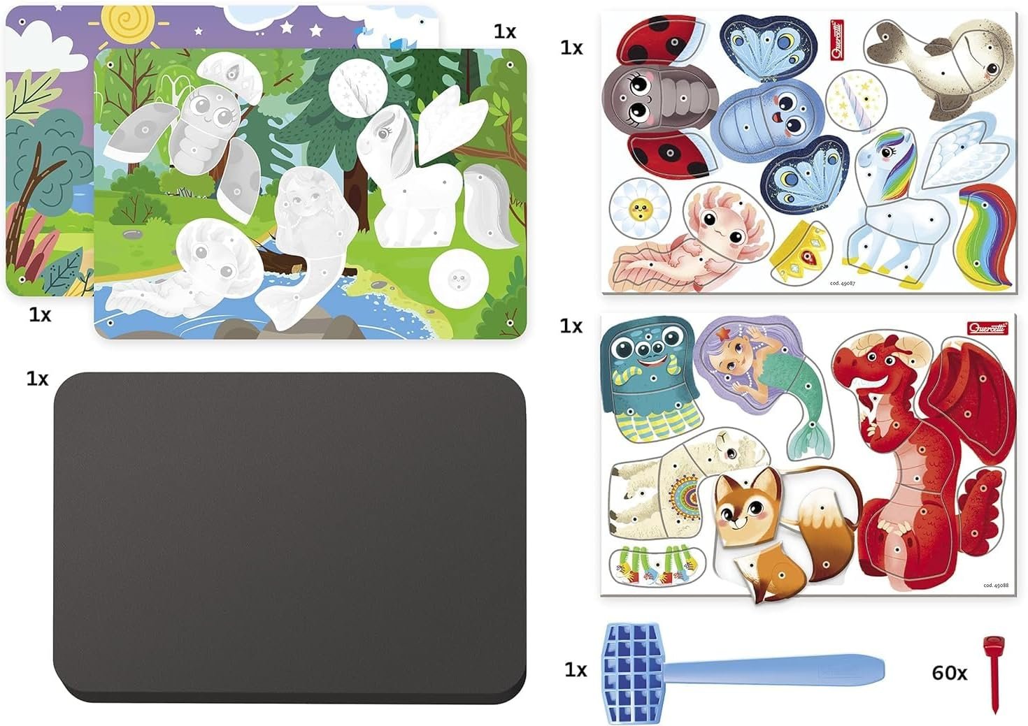 Цей чудовий освітній набір дозволяє дітям використовувати карточки, колышки та ігрушковий молоток для створення фігурок та історій за темою тварин. Фігури можна комбінувати та міксувати, щоб створити різноманітні сюжети та історії. Робоча поверхня та фігурки виготовлені з м’якого матеріалу для безпечного гри.