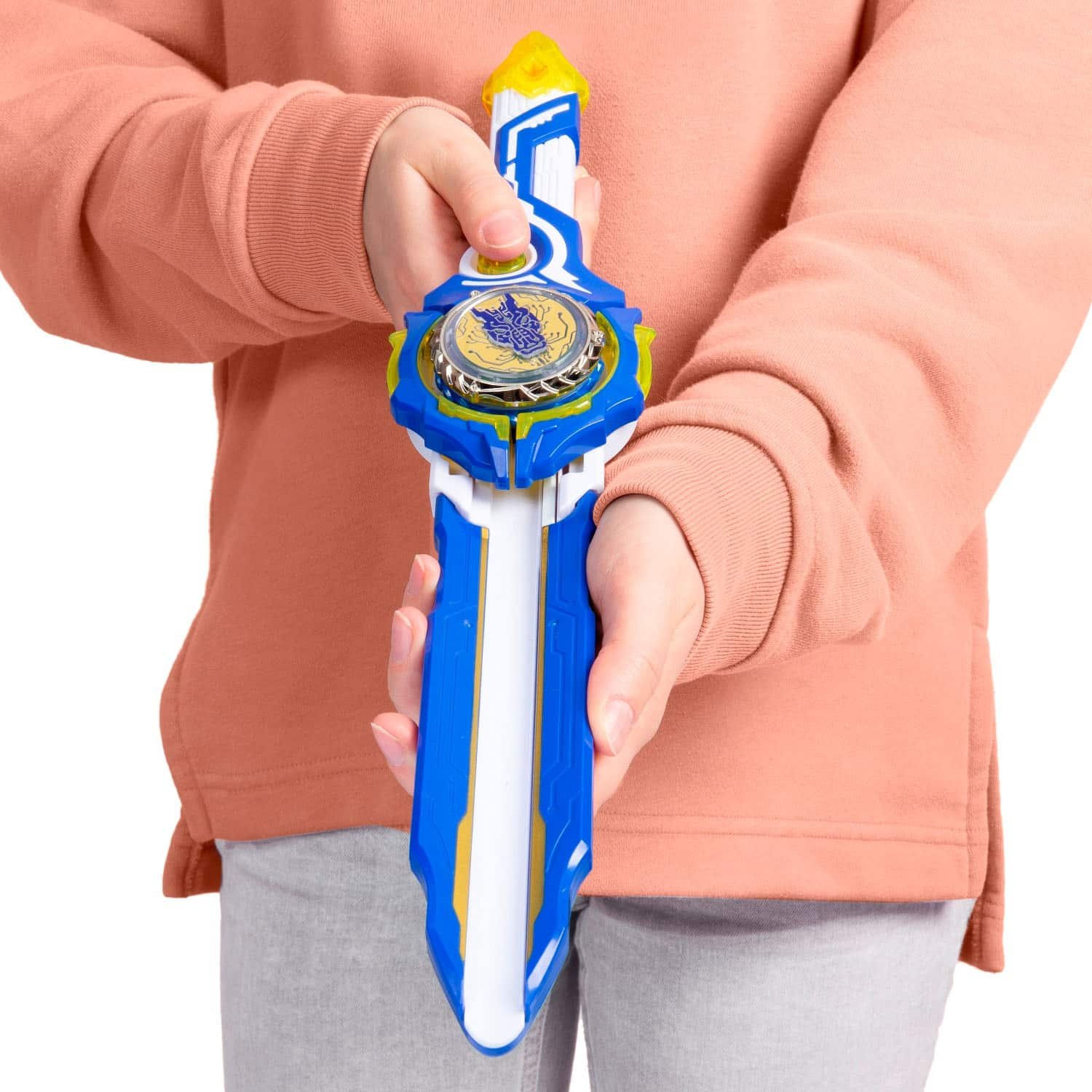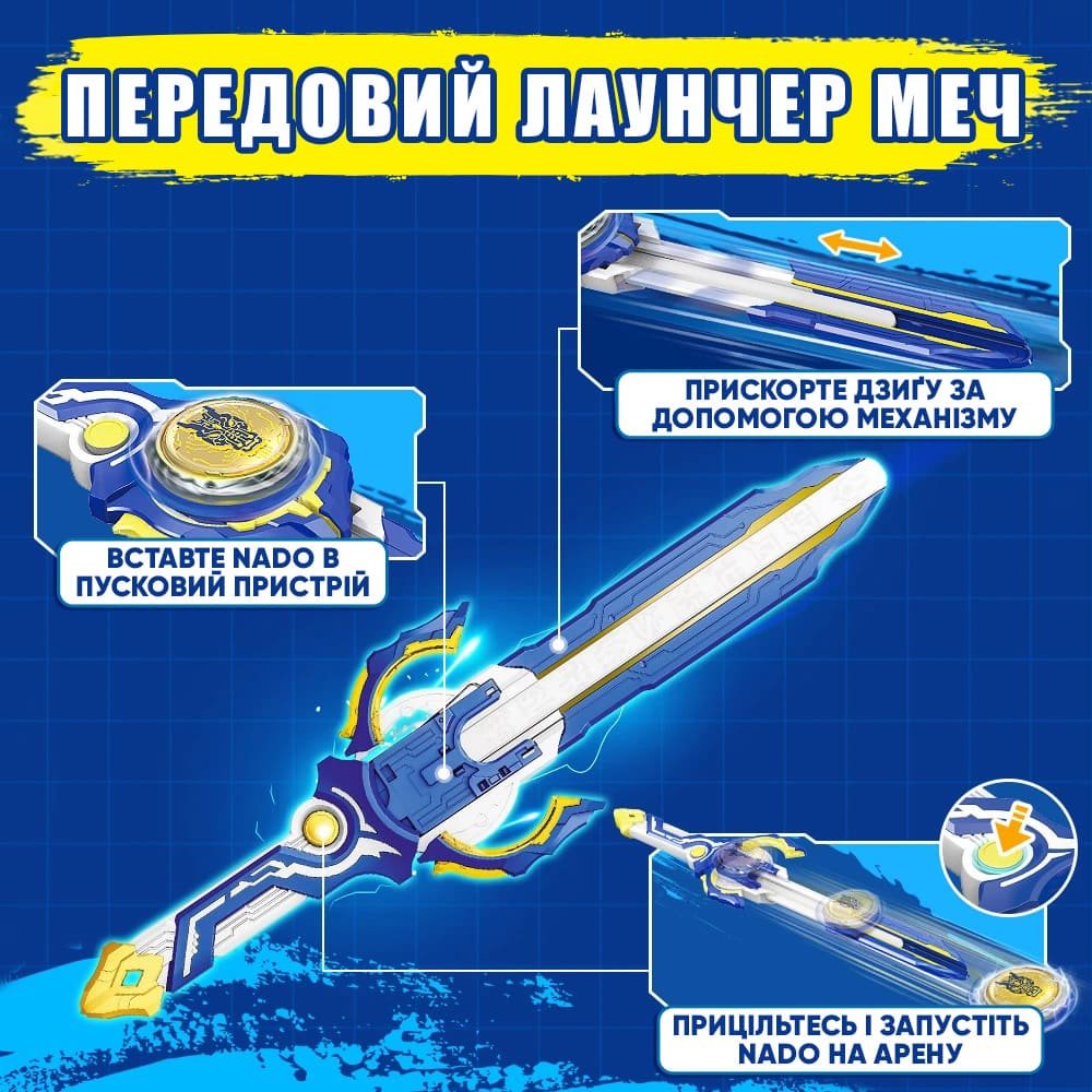 Лаунчер-меч із серії Advanced довше – 43 см, він має ергономічно покращену рукоятку зі спеціальним отвором – базою, яка “утримує” в собі дзига при установці “закриваючи” його, а після запуску “розкривається” і випускає.