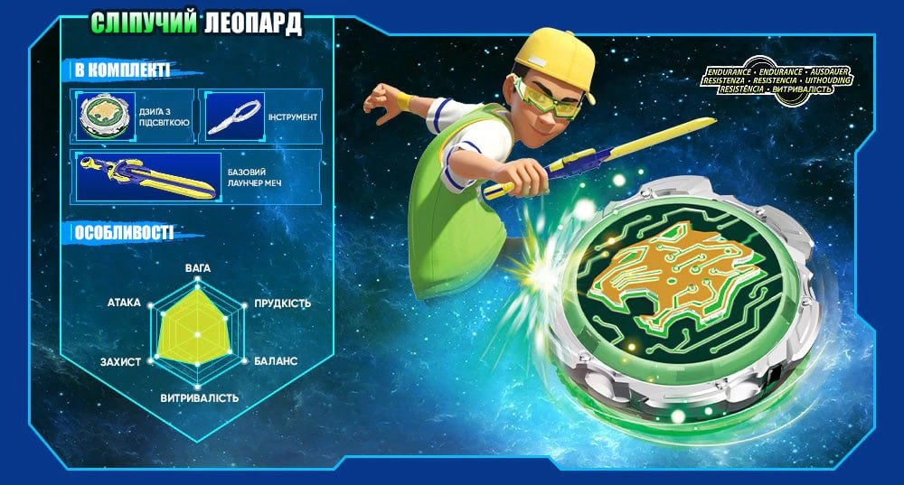 - Сліпучий Леопард: Набір містить у собі потужну дзиґу “Lightning Leopard”, готового до захоплюючих боїв та перемог.