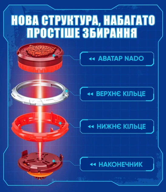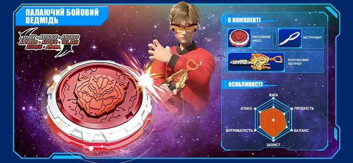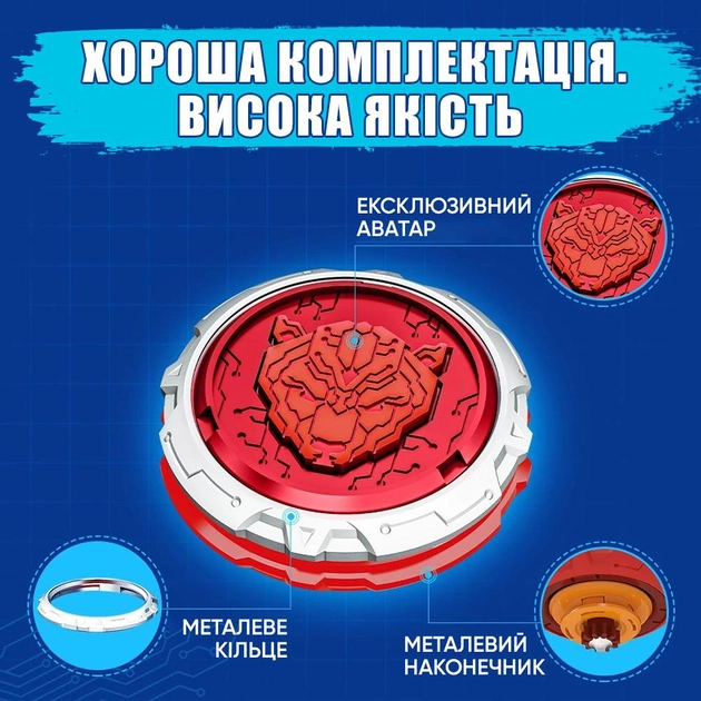 Високі показники дзиги в поєдинку забезпечуються збалансованим поєднанням металевого кільця, стійкої металевої основи та ексклюзивного аватара.