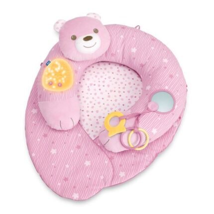 - Стимулювання розвитку: Килимок оснащений двома м’якими дугами, на яких підвішені різноманітні іграшки: брязкальця, дзеркальця, елементи з різними текстурами. Вони допомагають розвивати: