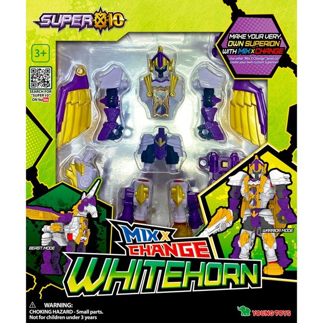 Готуйтеся до епічних битв за справедливість! Вайтхорн — це один із наймогутніших героїв команди Super 10, який втілює в собі незламну силу білого носорога. Завдяки системі MIX, цей трансформер має здатність до складної та водночас захопливої перебудови, перетворюючись із високотехнологічного бойового робота на масивну механічну тварину. Вайтхорн створений для захисту Землі від космічних загарбників, і його міцна броня разом із потужним рогом роблять його непереможним у ближньому бою.
