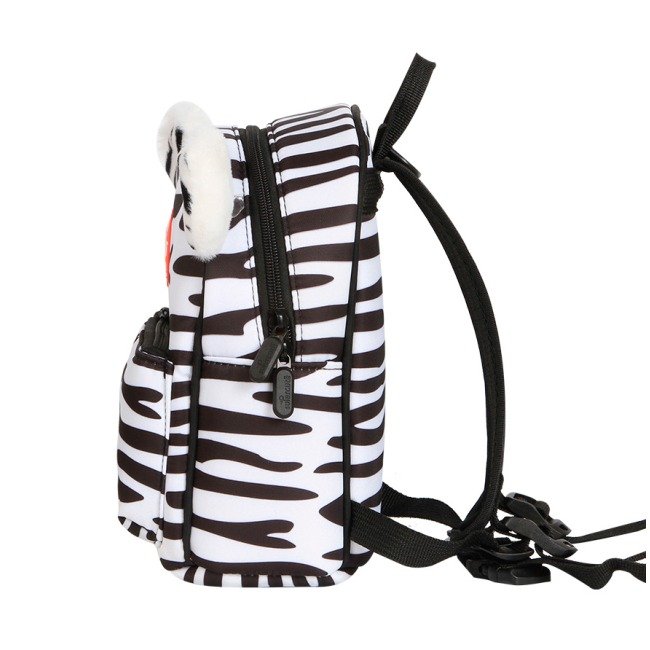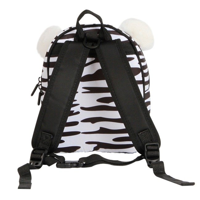 - Дизайн: Об’ємний (3D) дизайн у вигляді мордочки зебри з характерними чорно-білими смужками та вушками. Це не просто рюкзак, а іграшка-аксесуар.