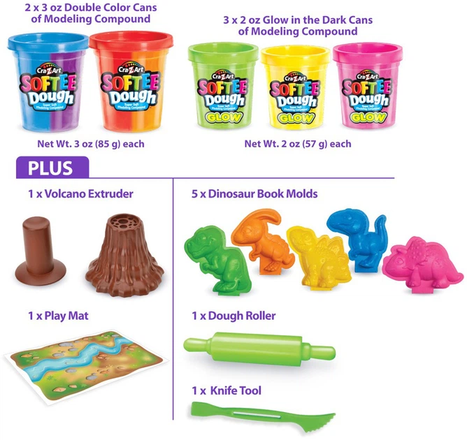 Приготуйтеся до великої подорожі в часі! Набір для ліплення «Динозаври» від Cra-Z-Art — це справжня знахідка для маленьких палеонтологів. Завдяки м’якому та пластичному тісту Softee Dough дитина зможе створити власну долину динозаврів населену грізними тиранозаврами швидкими трицератопсами та величними диплодоками. Велика кількість форм та інструментів у наборі дозволяє детально опрацювати кожну фігурку роблячи гру максимально реалістичною та пізнавальною.