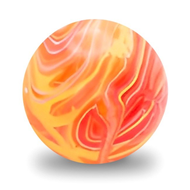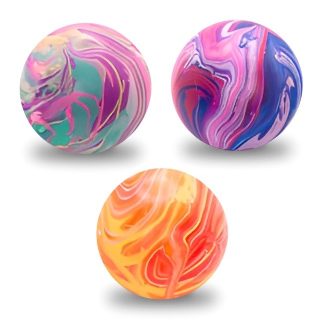 - Дизайн: М’ячик має захоплюючий мармуровий (або психоделічний) візерунок, де яскраві неонові кольори змішуються у химерні вихори та лінії. Це робить кожен м’ячик унікальним і привабливим для очей.