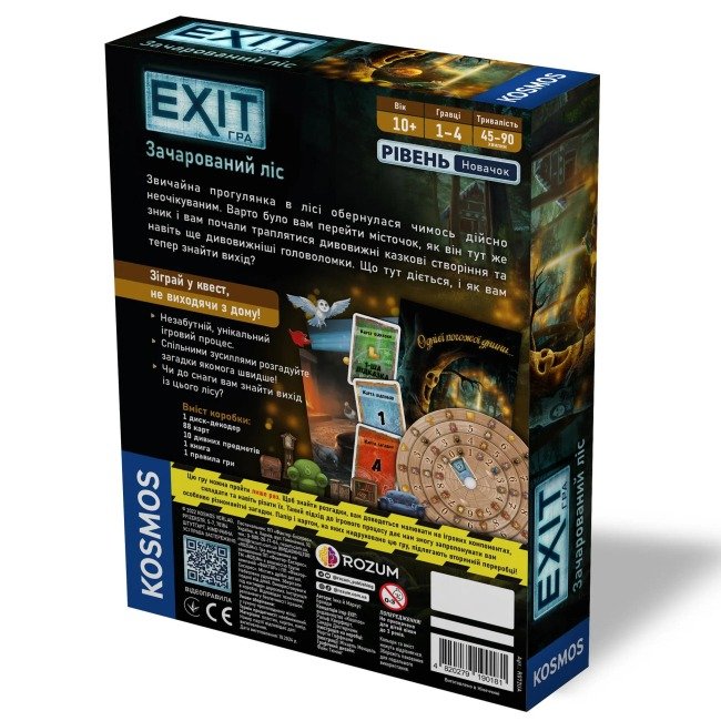 Настільна гра «EXIT: Зачарований ліс» — це захоплива гра-квест, що перенесе вас у таємничий ліс, де ви зустрінете казкових персонажів та розгадаєте безліч загадок. Вам доведеться працювати разом, щоб допомогти лісовим мешканцям і знайти вихід.