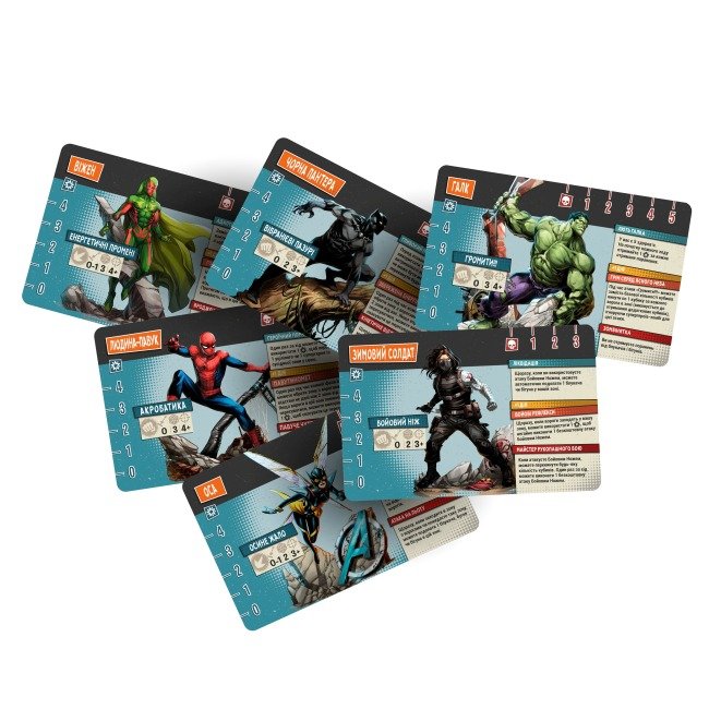 - Висока якість компонентів. Набір включає деталізовані мініатюри супергероїв та зомбі, які роблять ігровий процес ще більш захопливим та атмосферним. Якісне ігрове поле та картки дозволяють повністю зануритися в історію.