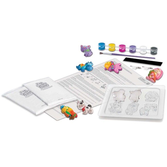 - Створення об’ємних фігурок. Набір дає можливість створити гіпсові фігурки домашніх тварин (наприклад, котика та собачки) за допомогою спеціальних форм. Після того, як фігурки застигнуть, їх можна розфарбувати та прикрасити на свій смак.