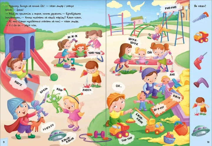 Деталізовані ілюстрації які візуально підказують який звук видає той чи інший предмет