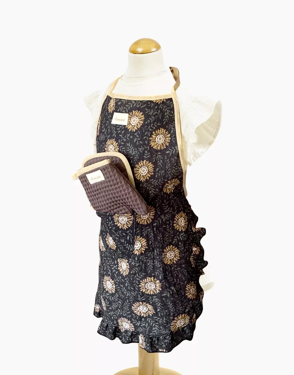 Елегантний та практичний набір для маленьких помічників від французького бренду Minikane — це поєднання витонченого дизайну та функціональності. Серія Marguerite вирізняється ніжним квітковим принтом який додає кухонним пригодам особливого шарму. Набір створений для того щоб дитина могла повноцінно брати участь у домашніх справах відчуваючи себе справжнім шеф-кухарем або кондитером захищаючи при цьому свій одяг від забруднень.