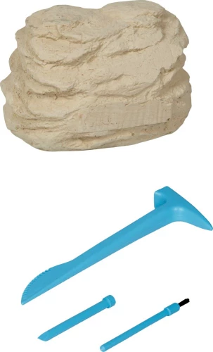 Процес розкопок: Дитина має за допомогою молотка та долота (входять до комплекту) звільнити деталі скелета з гіпсового блоку, що імітує породу.