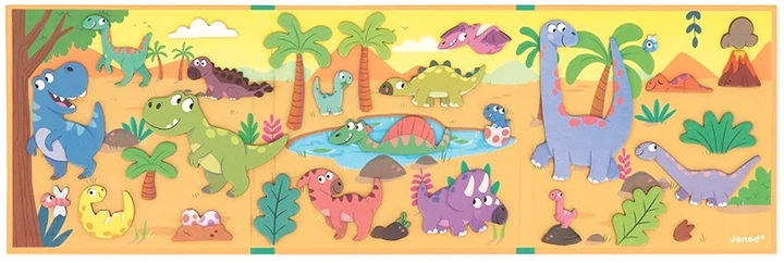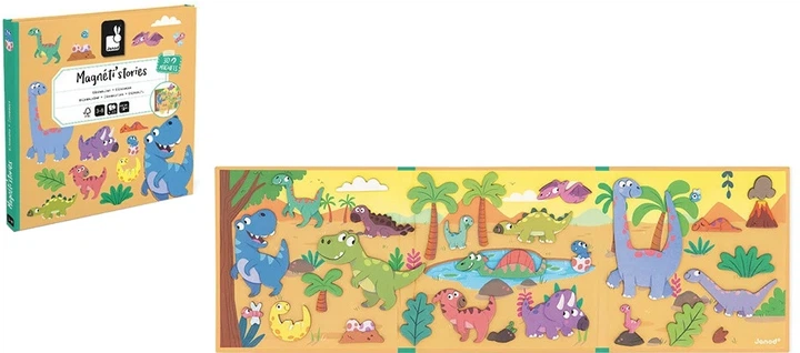 Поверніться на мільйони років назад у світ, де панували величні динозаври, разом із набором Janod Magneti’stories. Це компактна гра-панорама, що розкривається як декорація до пригодницького фільму. На відміну від класичних пазлів, тут немає єдиного правильного варіанту розстановки — дитина сама вирішує, де полюватиме тиранозавр, а де відпочиватиме миролюбний трицератопс. Магнітна основа надійно утримує всіх героїв, що робить цей набір незамінним для ігор під час подорожей.
