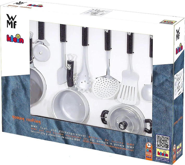 Додайте вишуканості дитячим кулінарним експериментам із преміальним набором від німецького бренду Klein. Цей комплект виготовлений за офіційною ліцензією компанії WMF — світового лідера у виробництві кухонного начиння. Усі елементи набору є точними мініатюрними копіями реальної серії WMF і мають стильний вигляд під нержавіючу сталь що надає грі особливої реалістичності та естетичного задоволення.