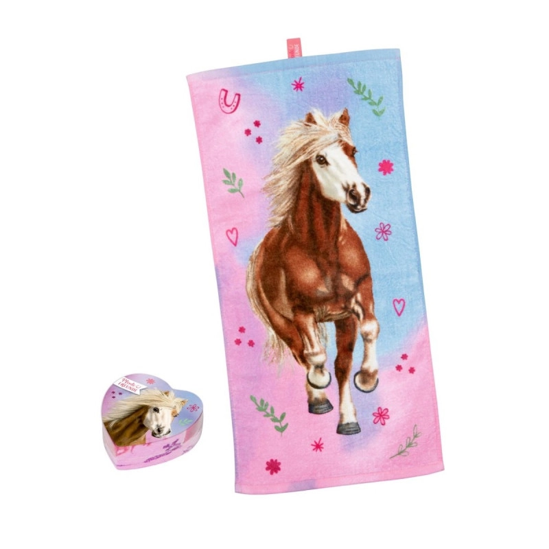 Дизайн: На рушнику зображений один із благородних коней серії «Друзі Коней» — часто це Голлі або інша конячка на тлі стайні, квітів чи підкови. Оформлення виконане у природних та пастельних тонах (зелений, коричневий, рожевий).