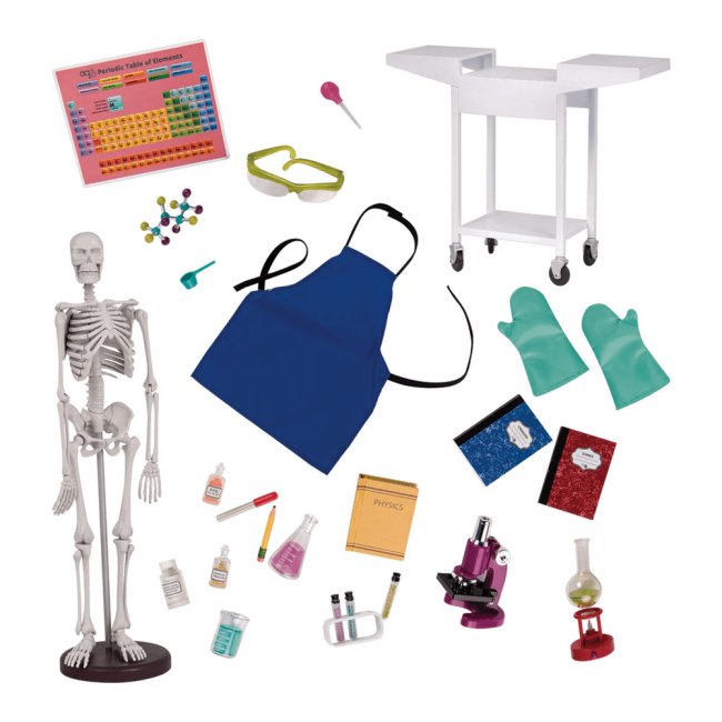 - В комплекті: різноманітні наукові аксесуари, такі як мікроскоп, хімічні елементи, таблиця хімічних елементів, рукавиці, фартух та ін.