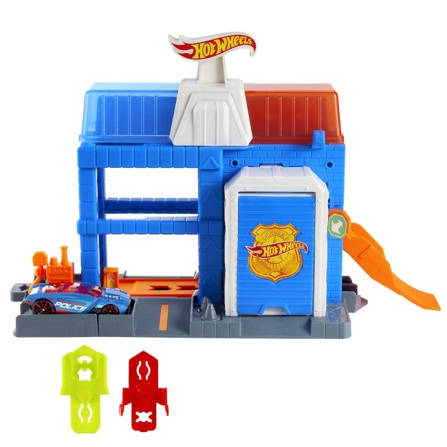 Downtown Police Tower — це компактний та динамічний ігровий набір із серії Hot Wheels City, який дозволяє дитині відчути себе справжнім захисником порядку в іграшковому мегаполісі. Набір поєднує в собі функціональність пускової установки та елемент міської інфраструктури, що робить його важливим вузлом будь-якої траси Hot Wheels.
