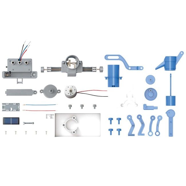 У комплекті є всі необхідні деталі: сонячна панель, двигун, редуктор, помпа, трубки та детальна ілюстрована інструкція. Дитина проходить шлях від набору гвинтів та пластикових елементів до створення робочого інженерного об’єкта.