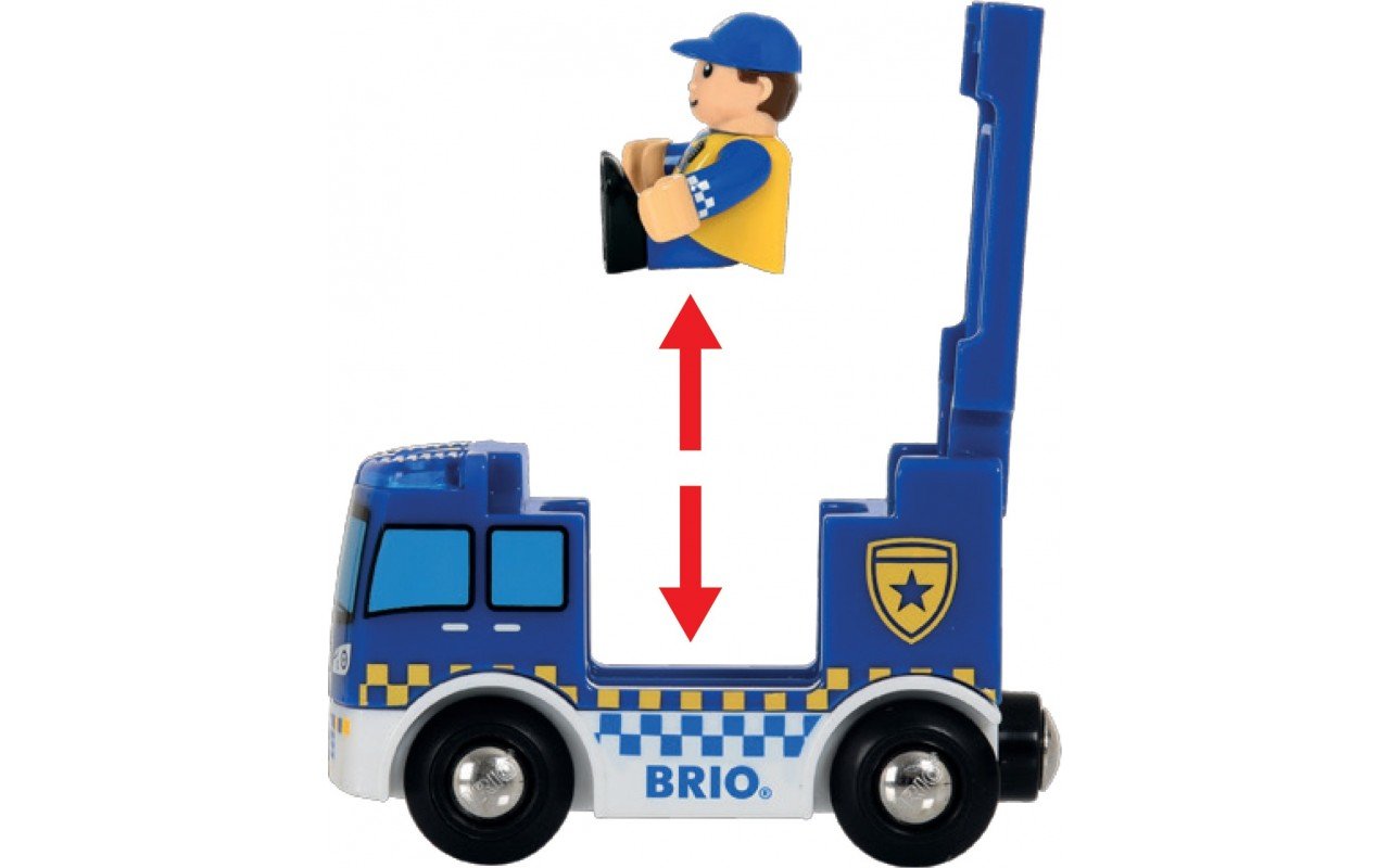 Кожне місто має свої ділянки поліції та іграшковий світ BRIO не є винятком. На сірій платформі з проїздом для поліцейської машини розташована темно-синя будівля із чорним дахом. На верхньому поверсі є камера для бандитів, а знизу стоянка для спецтранспорту. Злочинця доставили на станцію на поліцейській машині, обладнаній сиреною. За допомогою ліфта помістіть злочинця в камеру та зафіксуйте її ґрати. Увімкніть сирену і швидше рухайтеся на інший виклик!