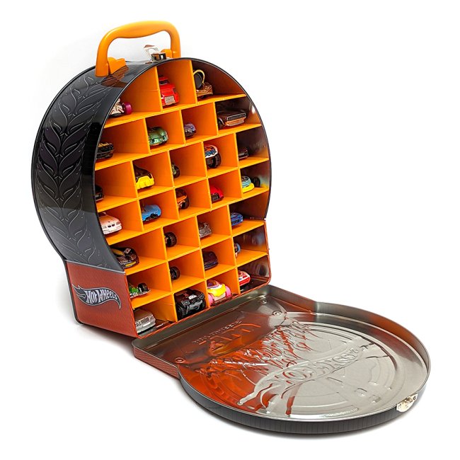 Металевий контейнер-колесо Hot Wheels – це зручний контейнер у формі колеса, призначений для зберігання і транспортування колекції машинок Hot Wheels. Завдяки спеціально розробленим відділенням та універсальній конструкції, у ньому можна розмістити до 29 машинок різних розмірів.