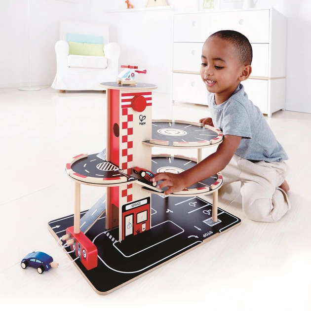 Паркінг дерев’яний Hape з гелікоптерним майданчиком – ідеальний подарунок для хлопчика віком 3 роки. Цей великий 4-поверховий гараж-паркінг з машинками вдихне малюка на безмежні часи творчої гри. Виготовлений з дерева, цей паркінг відповідає міжнародним стандартам якості EN 71 та ASTM F963 і не потребує батарейок.