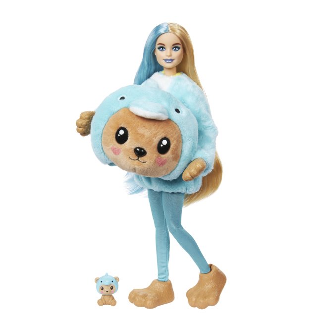 У коробці ви знайдете чарівного ведмедика в костюмі дельфіна з плюшу — такий милий! Зніміть голову костюма — всередині ховається сюрприз — стильна лялечка Barbie з довгим білявим волоссям із блакитними пасмами, 11 рухомими шарнірами і яскравим макіяжем на обличчі!