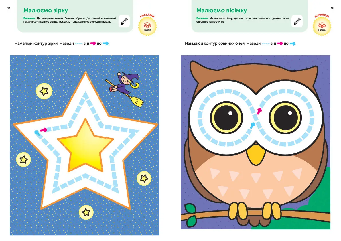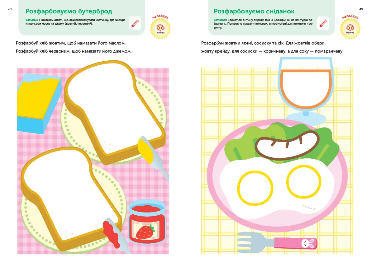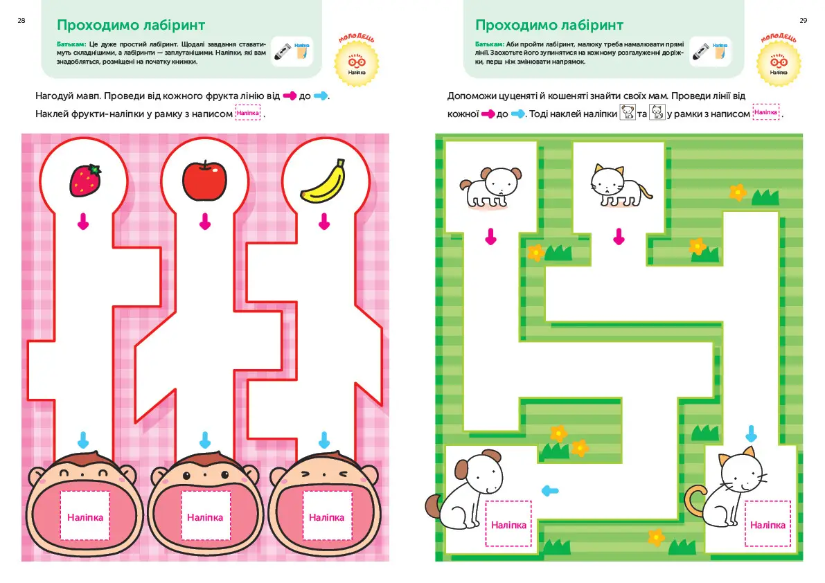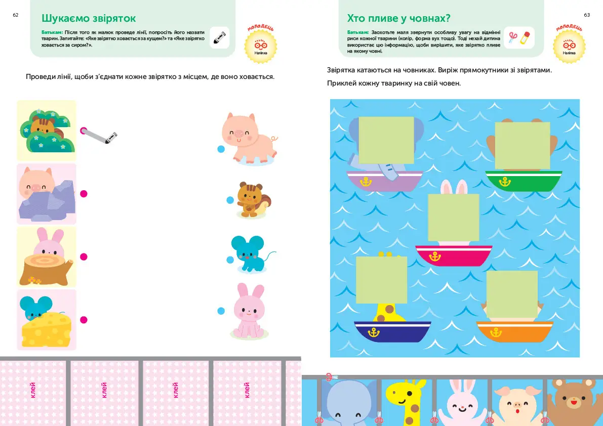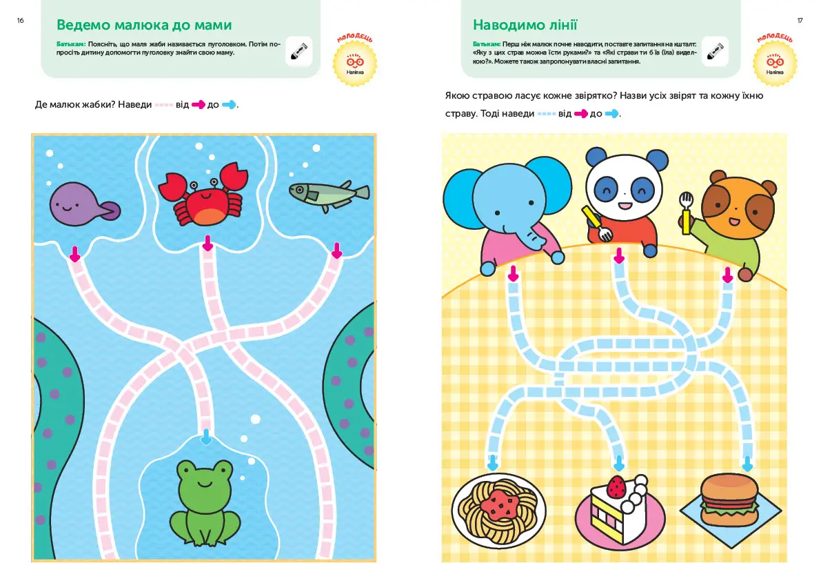 Коли дитина виконає вправу, можна поговорити з нею про те, що зображено на сторінці. Маля може показати й назвати тварин, об’єкти та кольори. Поміркуйте разом, які предмети на ілюстрації більші, а які менші. Або порахуйте зображені об’єкти. Кожне завдання ретельно розроблене таким чином, щоб розвивати конкретні навички. Проте малюку також дуже корисно буде поговорити з вами про картинки, які він бачить.