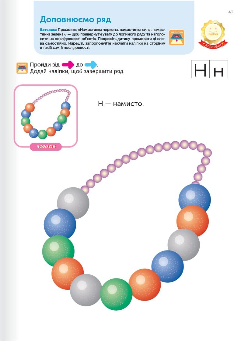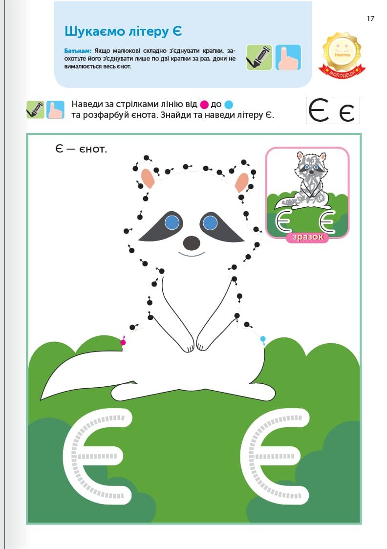 Абетковий порядок неважливий для вивчення літер, тому сторінки цього зошита не обов’язково проходити у якійсь визначеній послідовності. Якщо маля виявляє інтерес до певної літери або вправи, займайтеся ними, доки стане цікавості. Якщо ні — зробіть перерву чи перегорніть на іншу, цікавішу сторінку.
