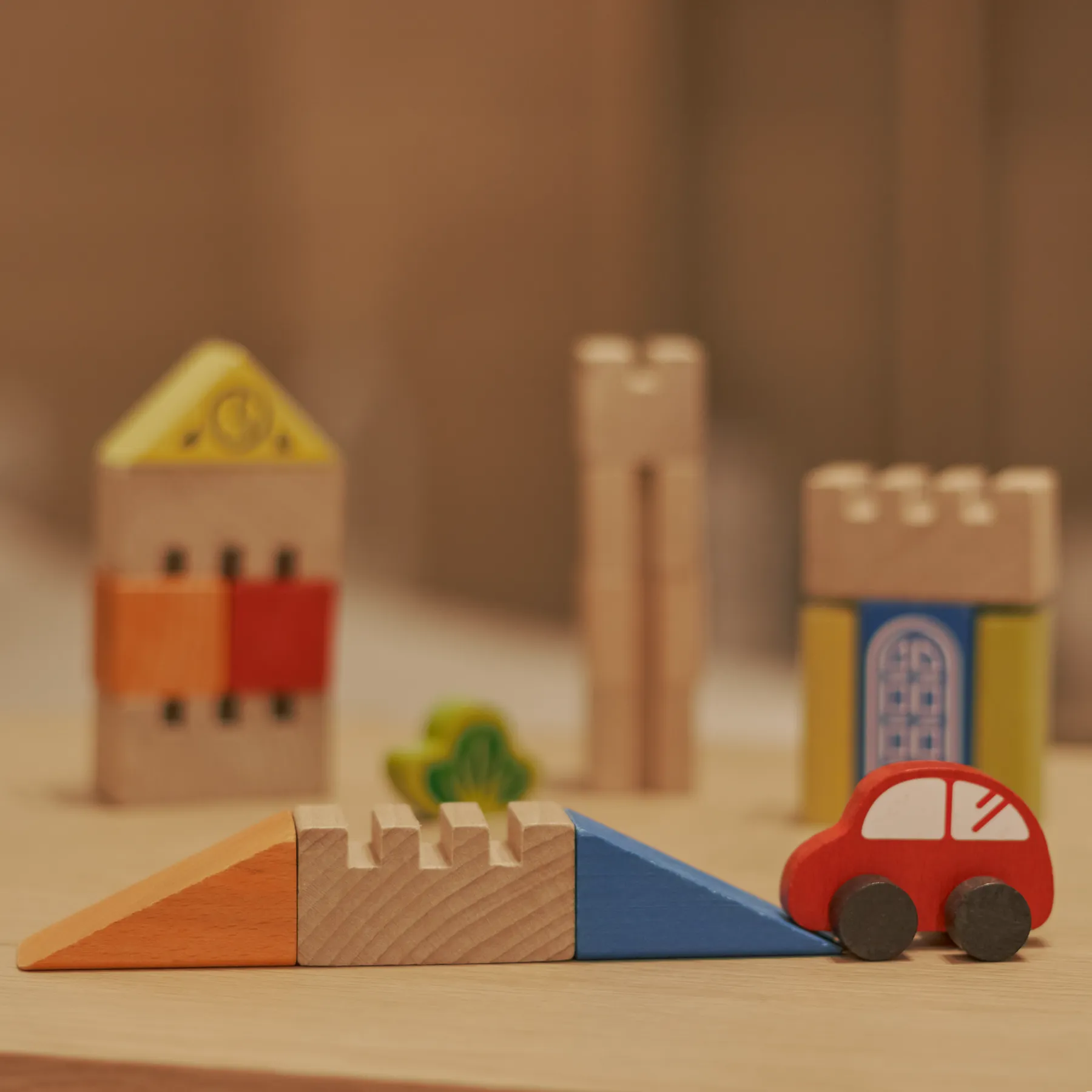 Дерев’яні будівельні блоки “Місто” з машинкою – це ідеальна гра для маленьких будівельників та любителів машинок. З 18 фігур можна створити маленьке містечко, побудувати мости, небоскреби та інші споруди, а потім насолоджуватися їздою машинки цим містом.