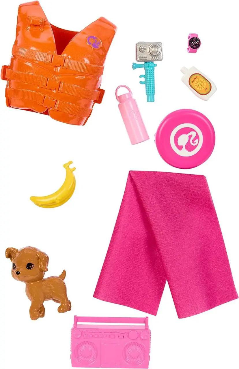 Що входить в набір: Набір включає ляльку Barbie, серфінгову дошку, домашнє цуценя та різноманітні аксесуари, необхідні для створення серферських пригод. Точний склад може варіюватися.